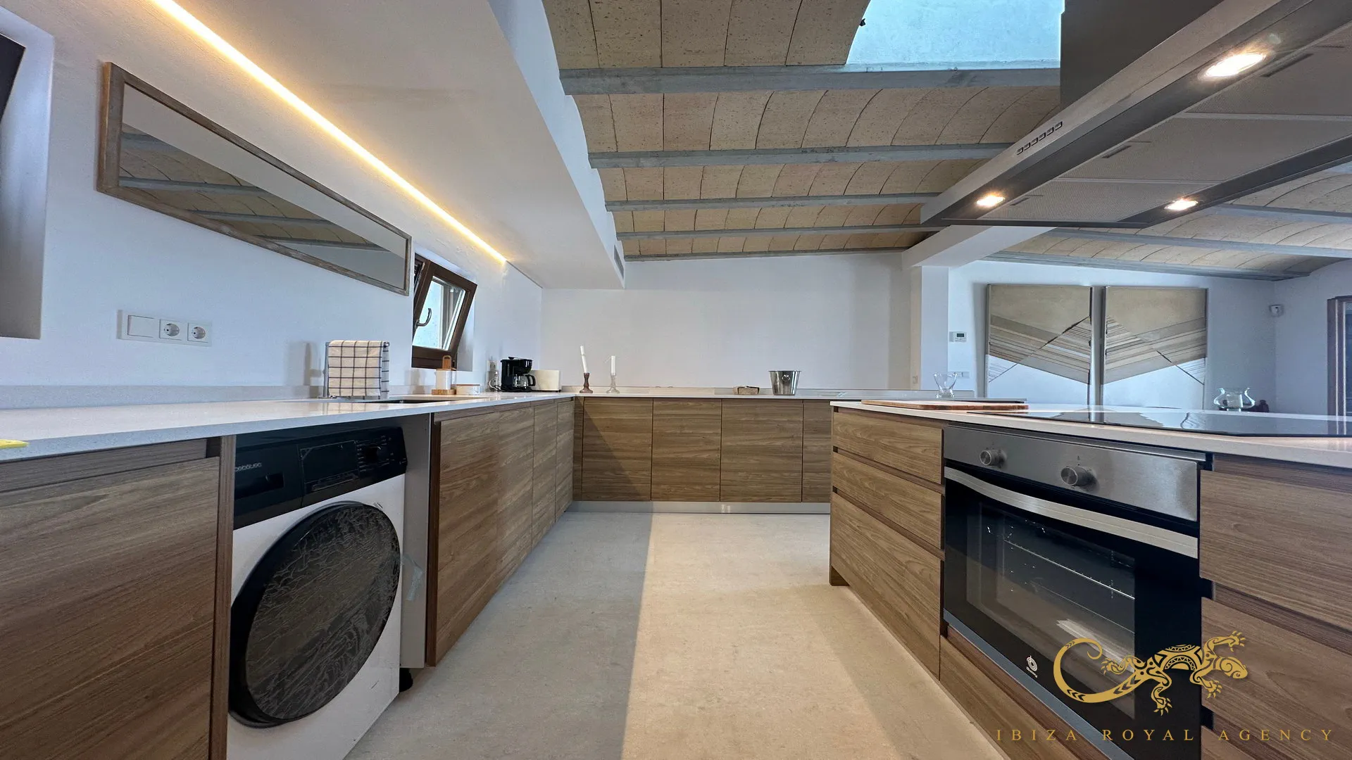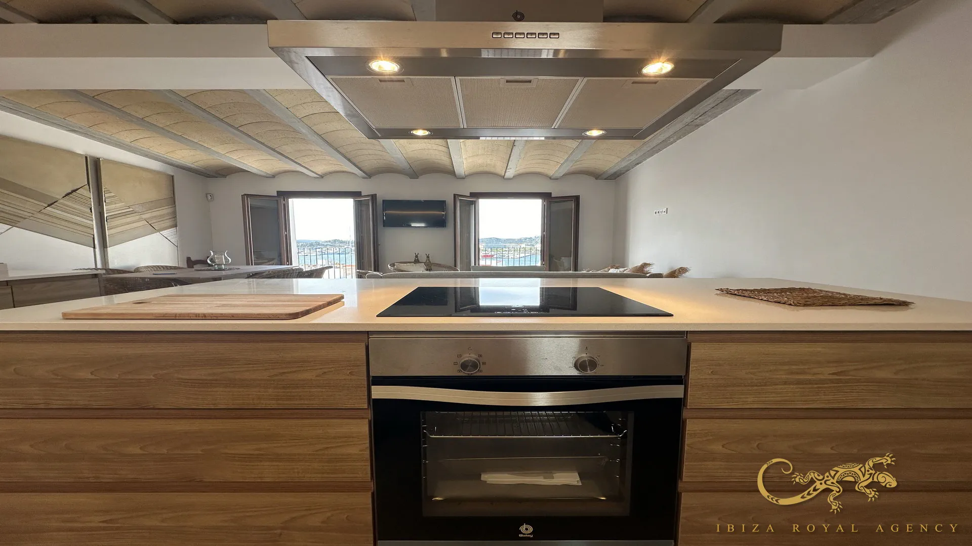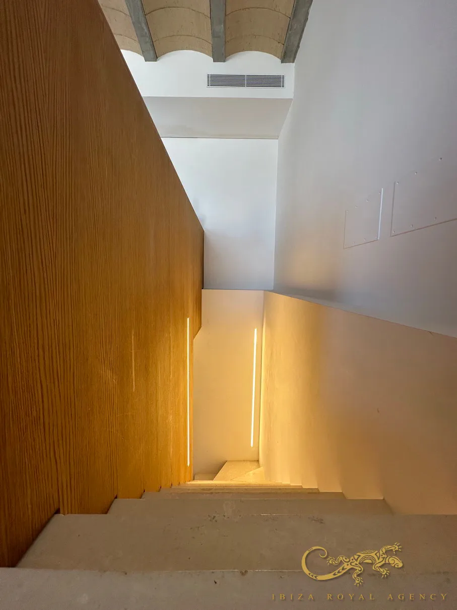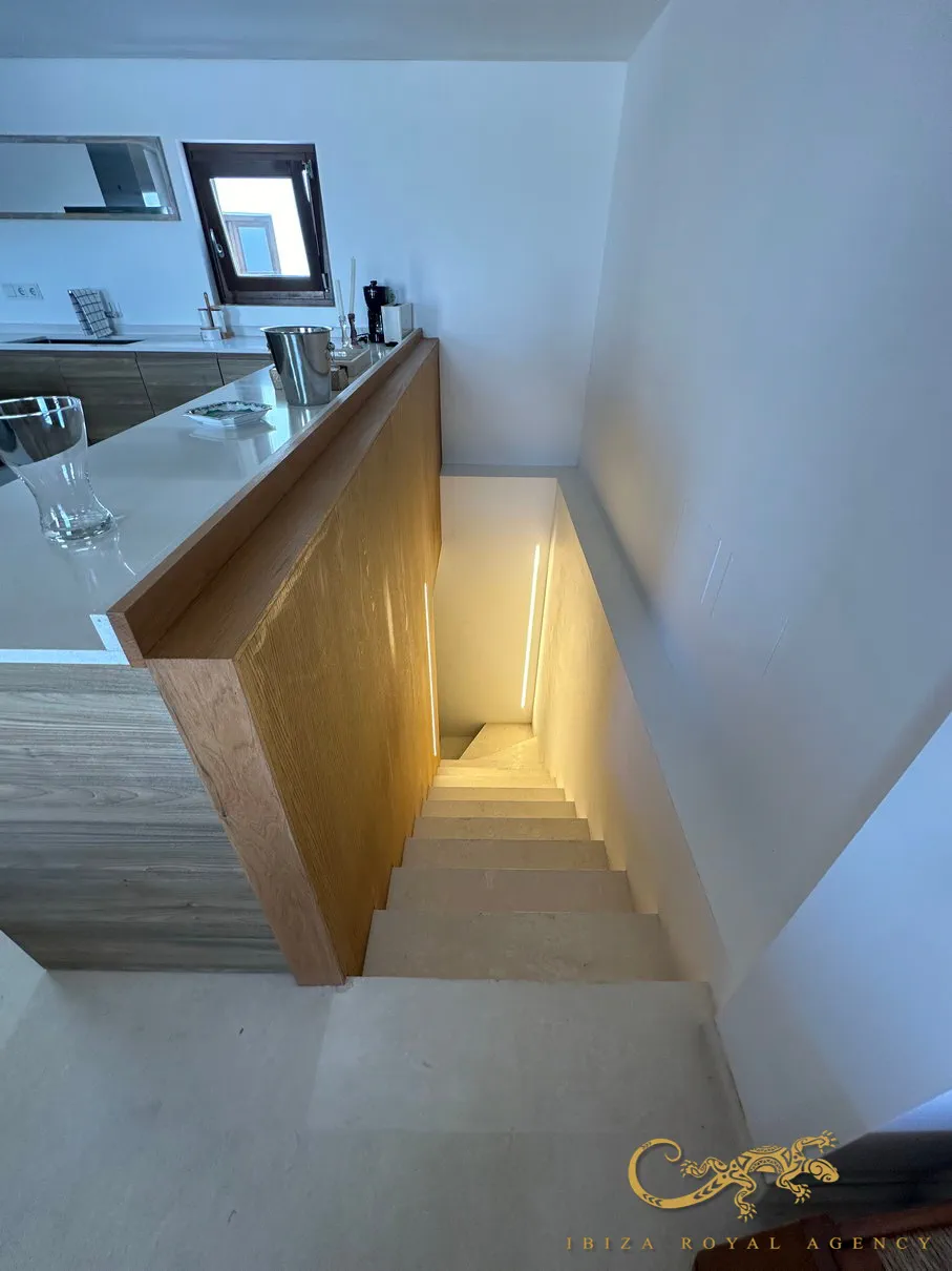 Op de eerste verdieping vindt u een ruimte vol natuurlijk licht. Hier bevindt zich een open designkeuken, uitgerust met de nieuwste generatie apparatuur en hoogwaardige afwerkingen. De keuken sluit naadloos aan op de woon-eetkamer, perfect om te ontspannen of gasten te ontvangen. Vanuit deze ruimte heeft u toegang tot kleine balkons met panoramisch uitzicht op de zee en de haven van Ibiza.