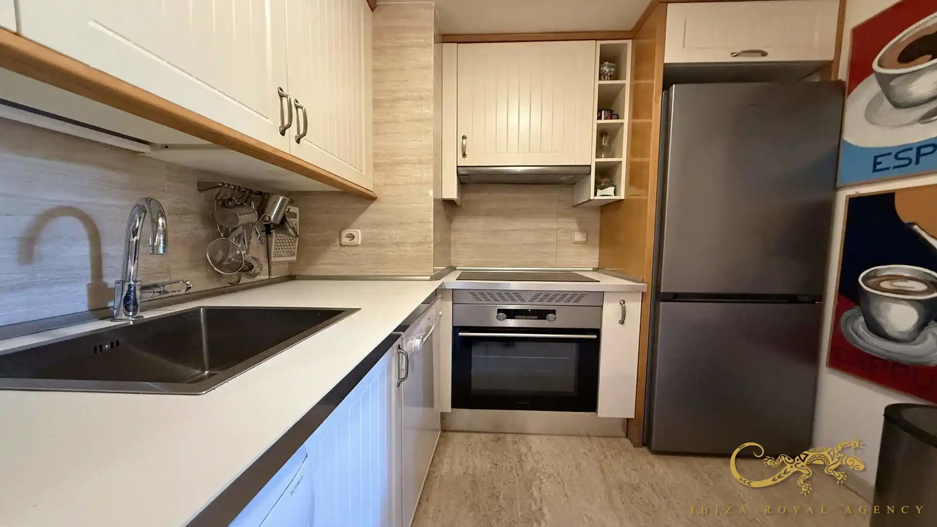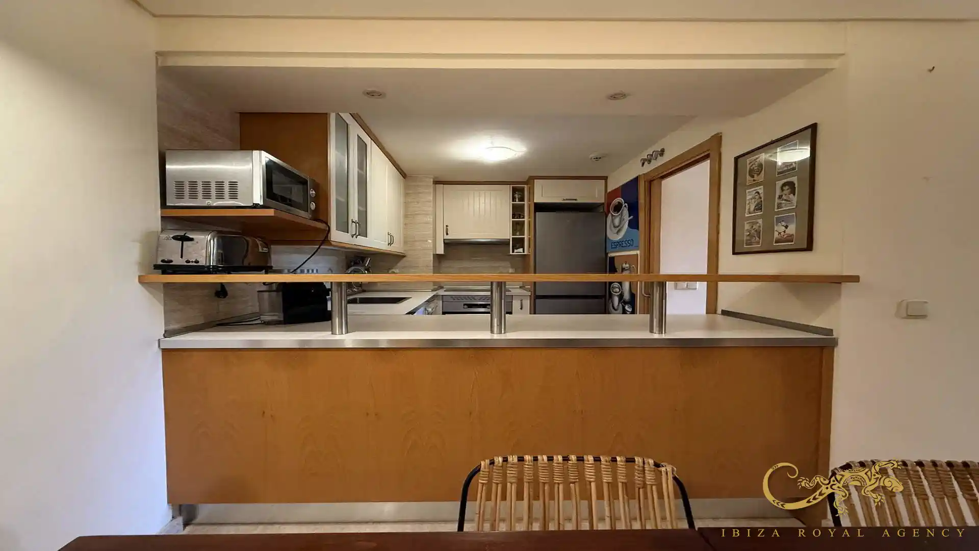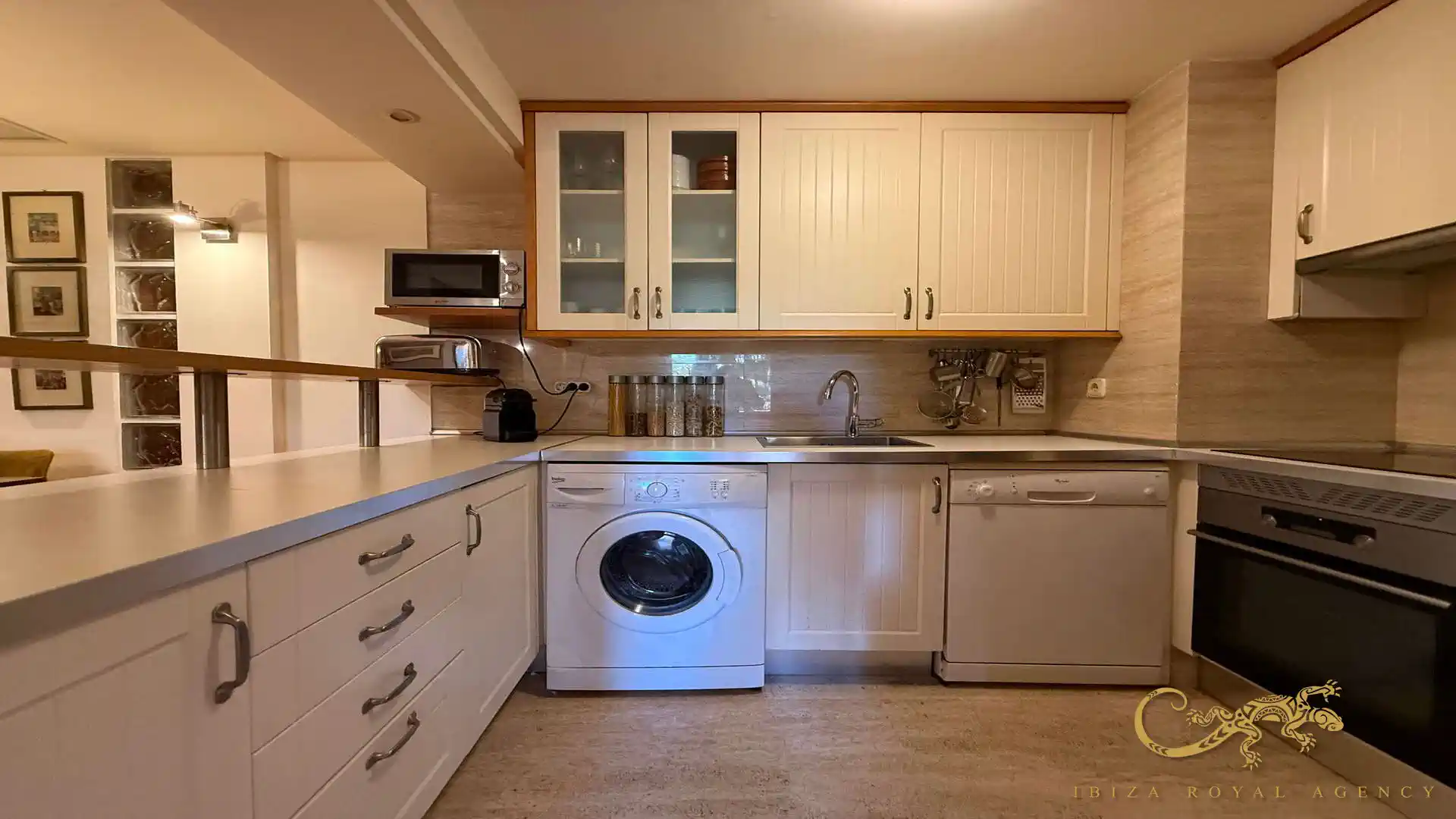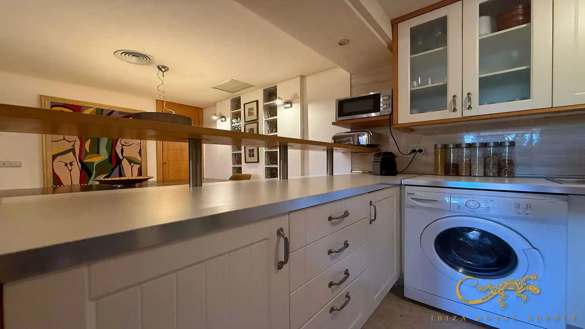 De volledig uitgeruste open keuken met bar sluit naadloos aan op de leefruimte. Het moderne ontwerp biedt zowel functionaliteit als stijl en is ideaal voor dagelijks gebruik of voor het ontvangen van gasten. De keuken beschikt over alle nodige apparatuur en voldoende opbergruimte voor een comfortabel verblijf per maand.