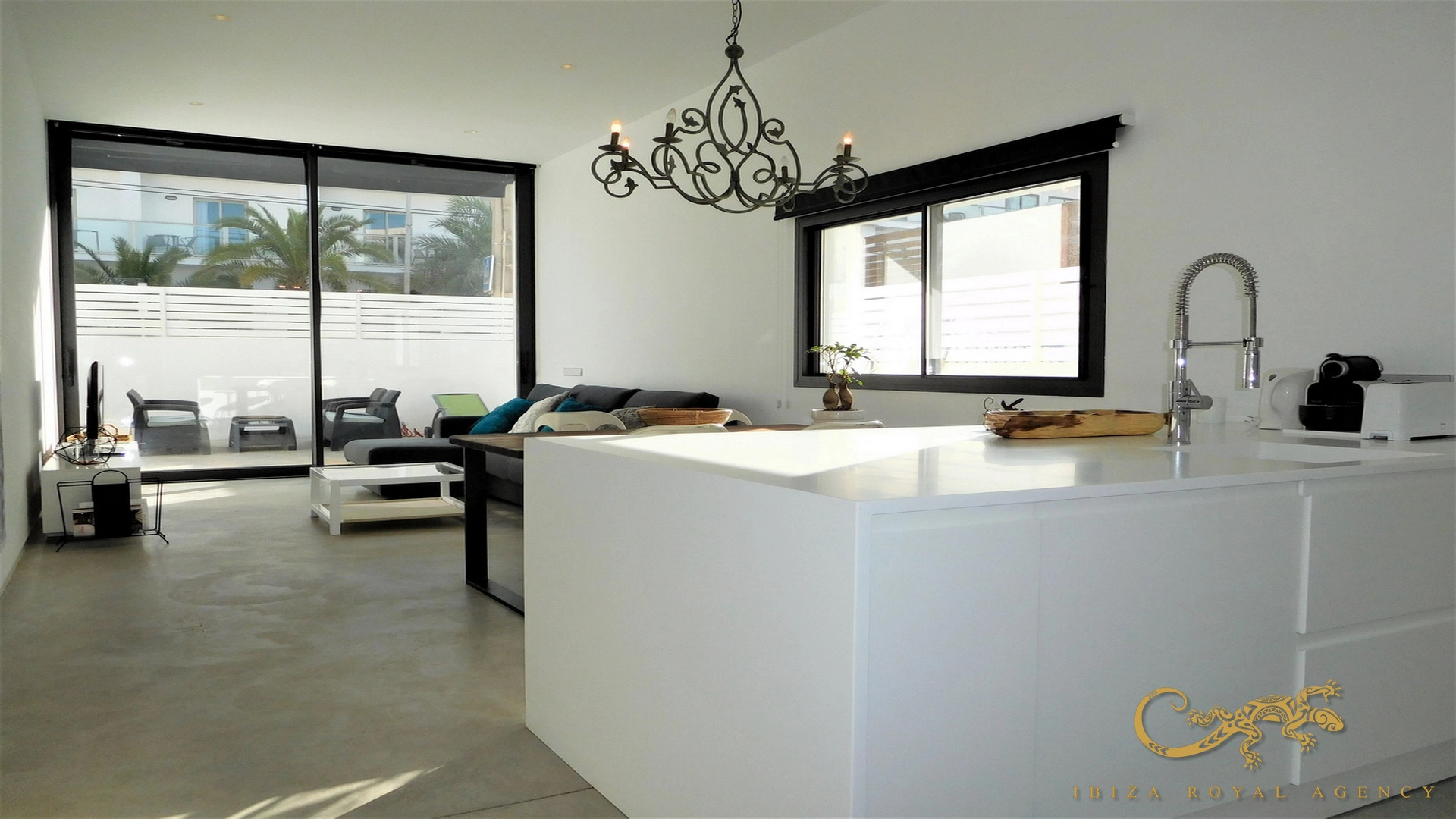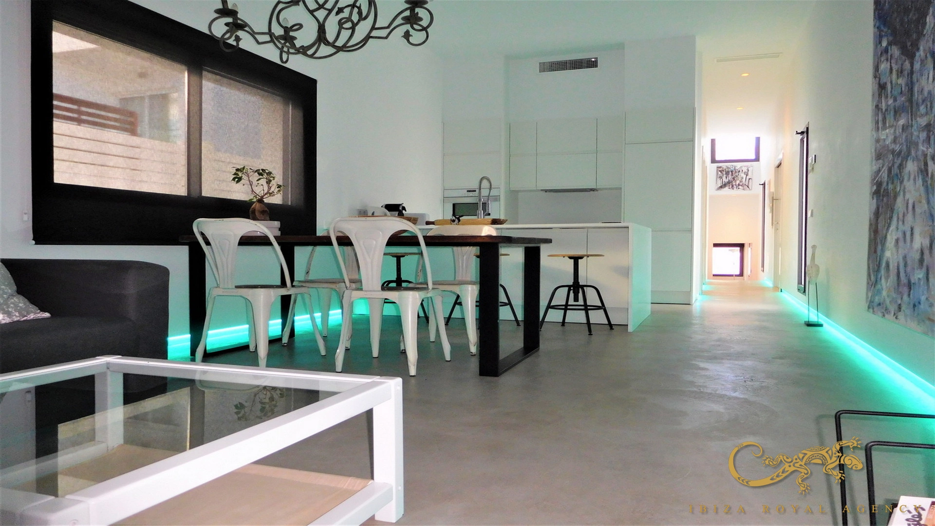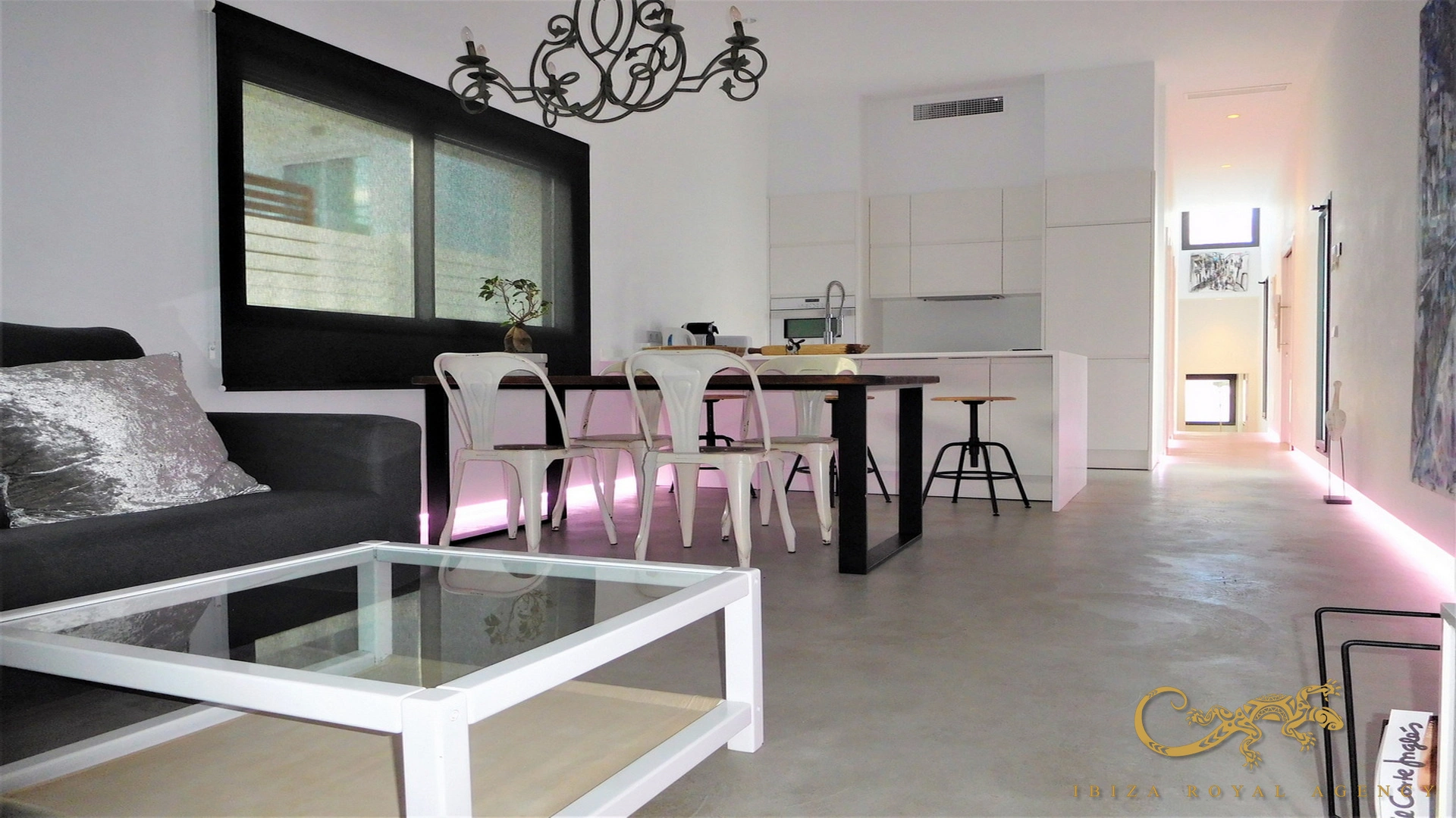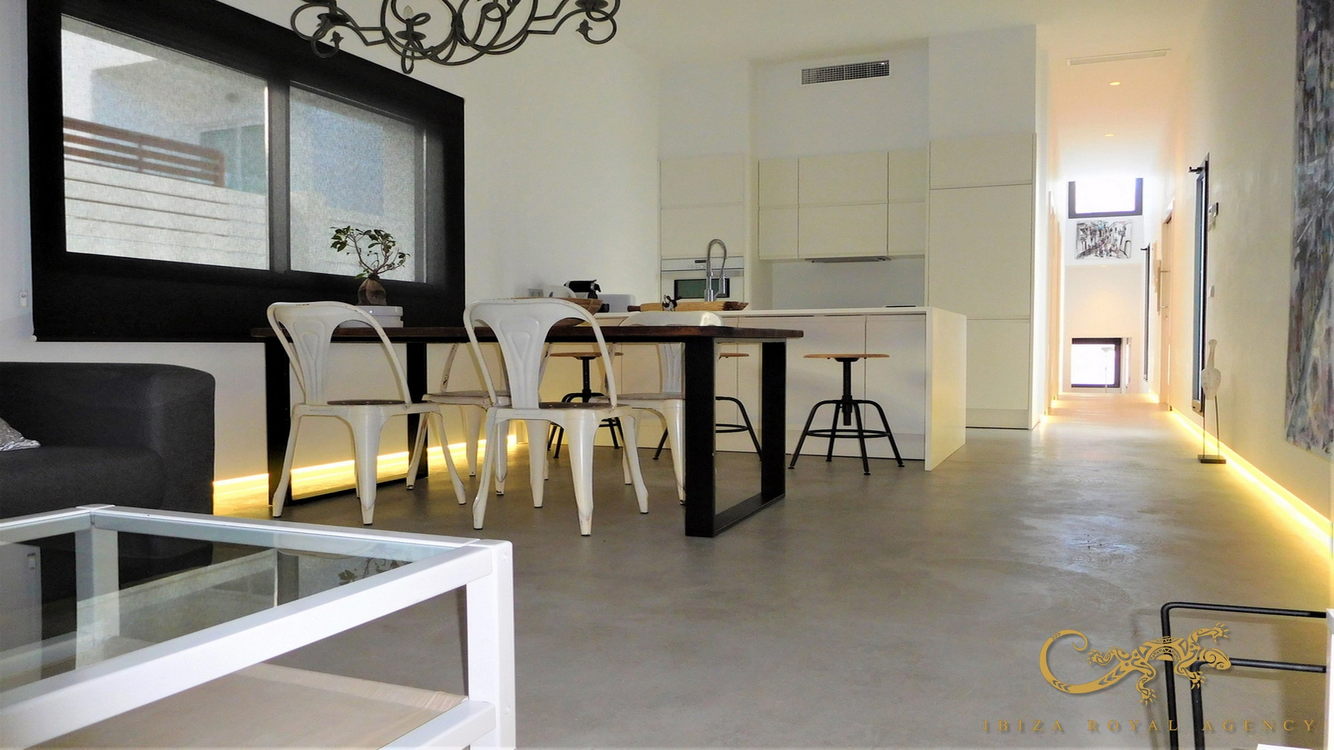 Deze woning van 120 m² in Sant Antoni de Portmany combineert modern design en functionaliteit. De ruime woonkamer is verbonden met een open, volledig uitgeruste keuken en biedt directe toegang tot de patio, wat zorgt voor een lichte en gezellige sfeer. De woning beschikt over twee tweepersoonsslaapkamers, waarvan één met een en-suite badkamer, en twee volledige badkamers met inloopdouche.